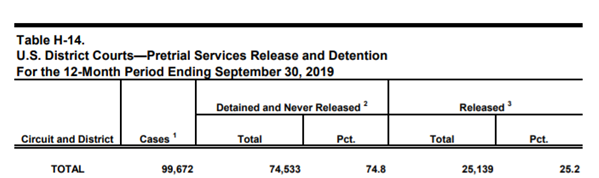 “In the federal system, money bail is rare, and lawyers are generally assigned before a defendant’s first court appearance. But the rate of pretrial detention is even higher than in state criminal court. Approximately 75% of federal defendants are locked up pretrial, compared to a 38% detention rate for defendants in state court.” – Pretrial Detention in a Pandemic by Sarah Turberville & Katherine Hawkins